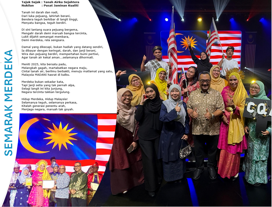 21st August 2025, Serdang - The Centre for Quality Assurance (CQA) of Universiti Putra Malaysia (UPM) has sent a CQA representative for the purpose of participating in the Competition Inter-PTJ Merdeka Poetry Declamation, Merdeka 2025 Celebration Program organized by the Sultan Salahuddin Abdul Aziz Shah Cultural and Arts Center (PKKSSAAS) UPM. Puan Nurainakmal Kamal Bahrin, Administrative Officer/Head of Documentation Section, Service Quality Assurance, CQA UPM, presented a poem in the form of a rhyme entitled “Tanah Airku Sejahtera". The poem was a joint compilation by the Quality Assurance Center. At the ceremony, which was held in full splendor, the UPM CQA Representative was successfully crowned as the recipient of the Special Jury Award for the Best Costume Category in the competition. For the purpose of variation, the stage performance was also assisted by several CQA staff namely Puan Puteri Nurasikin Nasarudin, Puan Norliyani Anor, Puan Anis Syahirah Abdullah, Mr. Izzul Muzakkir Aris, Mr. Muhamad Amirul Ashraf Zulkifli and Ms. Najidah Salim. Preparation for this participation is also the result of the cooperation of all CQA staff in providing support in the form of a support team who play a role in assisting in the preparation equipment and presentation training. This participation initiative has had a positive impact in highlighting CQA's visibility in terms of teamwork culture and appreciation of innovation and creativity in tasks. |